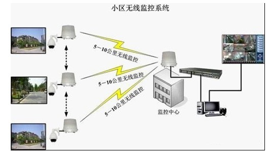 小区安装视频监控系统,拉线的费用较大,施工周期长,成本高,硬化的路面得切割,项目做完还得回填。使用无线监控可以免去开挖及架空拉线的费用,并可以缩短项目的建设周期,减少费用。无线监控的实现使得后期的维护可以简单快速,非常适合用于小区。