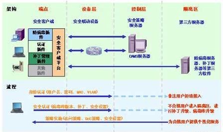 系统补丁、病毒库版本不及时更新或已感染病毒的用户终端,如果不符合管理员设定的企业安全策略,将被限制访问权限,只能访问病毒服务器、补丁服务器等用于系统修复的网络资源。