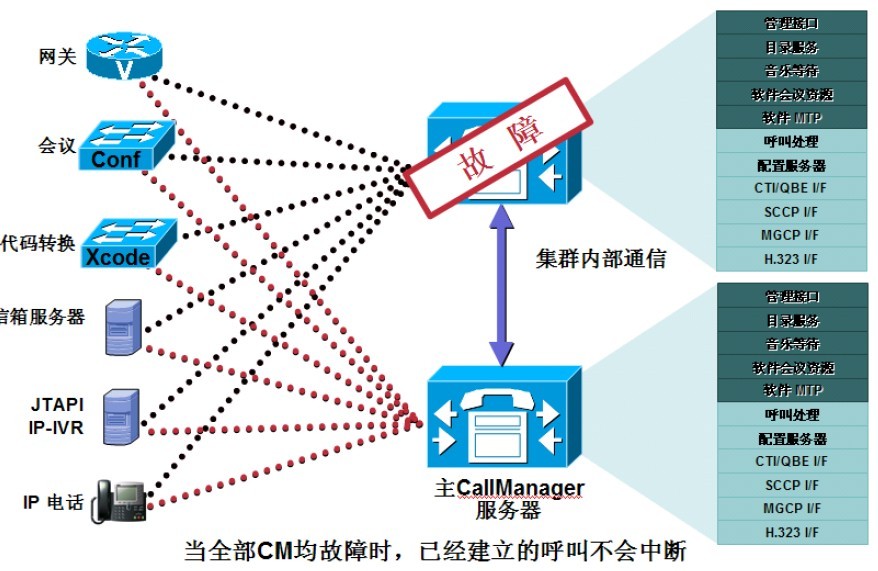 全部或部分的语音网关、IP电话等设备在系统或网络正常的情况下,注册到主服务器。一旦出现网络故障或服务器故障,全部设备和IP电话均自动转移到备用的CUCM服务器上;在CUCM服务器群集的内部,各个服务器之间实现呼叫控制和终端、网关状态等数据的数据库同步和分发机制,当发生服务器切换或IP电话转移服务器时,不会导致系统终端,甚至在两个或多个备份的服务器全部终端的情况下,已经建立的通话都不会受到影响。