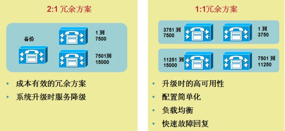 当一个服务器的容量不够支持大量的IP电话时,可配置多余一个的CUCM服务器,实现群集。当多个服务器群集的总容量满足最终系统需求时,实际已经实现了一定意义上的CUCM服务器冗余配置,即1:1冗余。因为当任何实现,一般不会出现每个服务器同时达到最大通信容量的情况,所以,当多个服务器群集的配置下,已经实现了一定的备份机制。