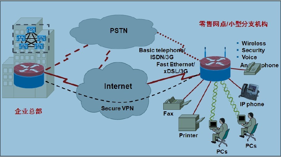 本方案中,适用于规模较小的零售网点,采用了思科SRST技术,IP语音通过总部集中管理和控制。SRST功能提供了本地呼叫处理能力,保证了业务的连续性。智能接管,以及自动回复。