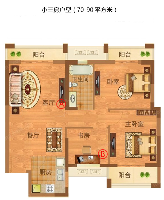 目前多为此类户型,面积中等,室内房间、墙体隔断较多,如果要做到无线信号全屋无线覆盖,需要选择穿墙性能良好的路由器,将路由器摆放在房屋中央地带-客厅A 点,可以保证客厅、餐厅以及卫生间、书房等位置的信号覆盖,而隔着两三堵墙之外的主次卧室以及阳台,就需要更强的信号扩展了,可以选择功率较大的穿墙路由或者在B点使用信号放大器。