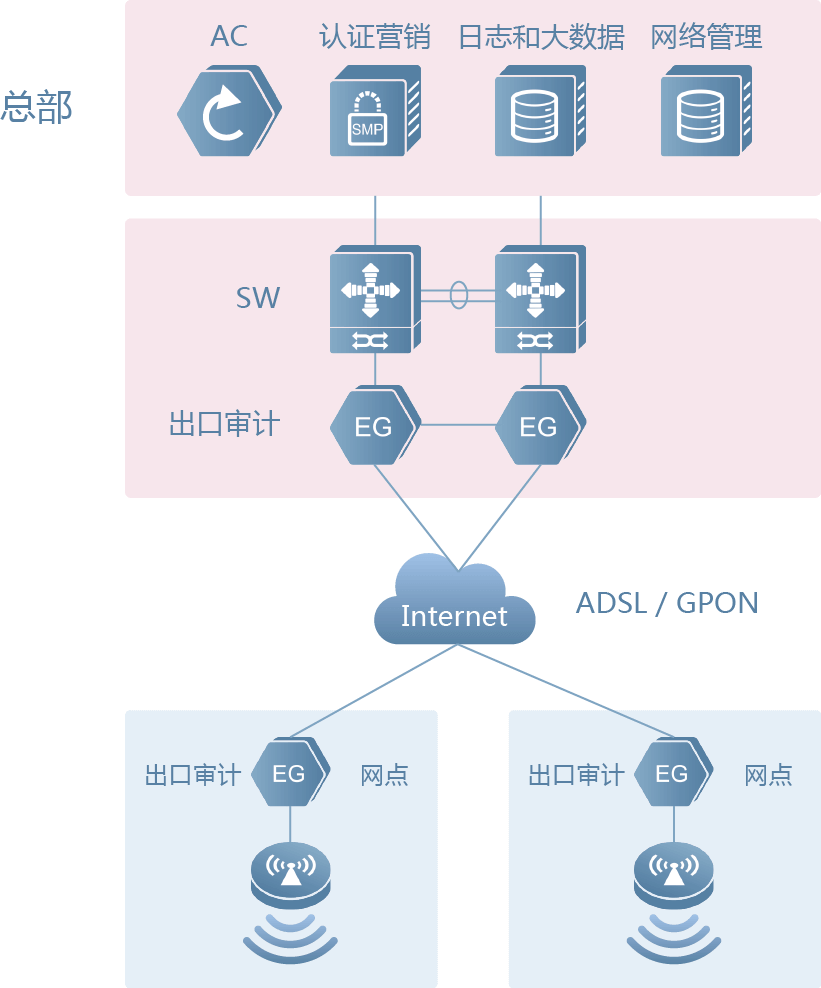 ③:网络管理:用于统一管理网点出口网关、AP 以及一级分行内的网络设备;