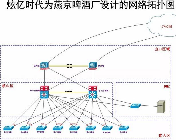此次燕京啤酒厂房网络建设主要针对企业未来5年发展规划来设计网络架构!根据企业业务特性,使业务平滑升级部署,采用三层网络架构,冗余部署的方式、有效保障有线和无线使用效果!