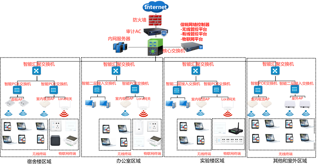 1、根据校园景采用不同方案统一组网,实现室内、室外无盲区覆盖,信号稳定、速度快。依据接入人群创建不同的无线网络,办公网、教学网、学生网相互隔离,互不影响;
