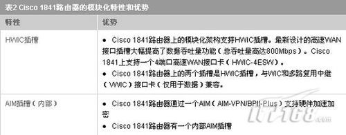 Cisco1841路由器提供了增强模块化功能,同时可保护客户投资。此模块化架构的设计可提供支持并发安全应用所需的更高带宽和性能。Cisco1841支持大部分现有WIC、多路复用中继接口卡(仅用于数据)和高级集成模块(AIM)。表2列出了Cisco1841路由器的模块化特性优势。