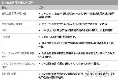 Cisco1800系列在主板上提供了可由可选Ciscoioses软件安全镜像支持的内置硬件加速加密。板载硬件加速加密卸载了加密过程,提供了更高的IPSec3DES和AES吞吐量。凭借可选VPNAIM、用于病毒防御的NAC和基于Ciscoioses软件的防火墙和IPS支持的集成,思科提供了适用于中小型企业和大型企业分支机构的、业界领先的强大、可适应安全解决方案。表3列出了路由器中集成的安全特性和优势。