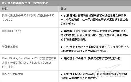 Cisco1841路由器延续了为中小型企业和小型企业分支机构提供多功能性、集成性和强大功能的传统。它提供了许多改进来支持分支机构中多种集成服务的部署。表4中列出了降低拥有成本和提高易用性的主要特性和优势.