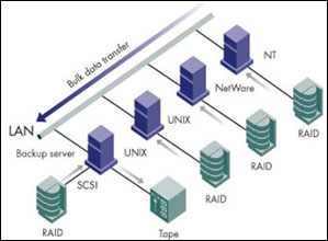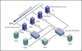 LAN上的传统备份与恢复模型,其中有一台对存储资源进行控制的主服务: