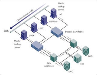 光纤通道 Fabric 的交换式 2 Gbit/sec 全双工性能可以大幅提高备份与恢复性能。另外,光纤通道能以比IP网络更高的效率和更大的可靠性,传送大量数据。有两个被普遍采用的 SAN 备份与恢复方案常常被称作“无 LAN ”和“无服务器”备份与恢复模型。